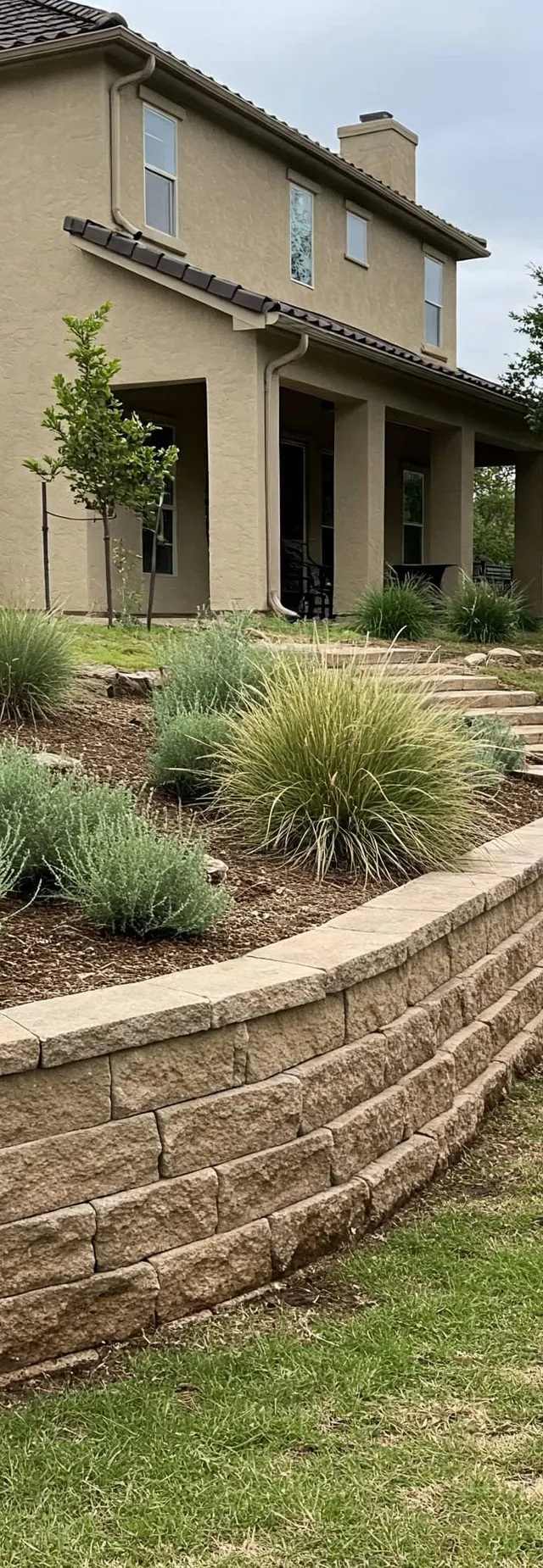 Tiered retaining wall systems and raised garden beds are used to add dimension and manage steep yards. These are great for creating plantable levels and organizing large outdoor spaces.